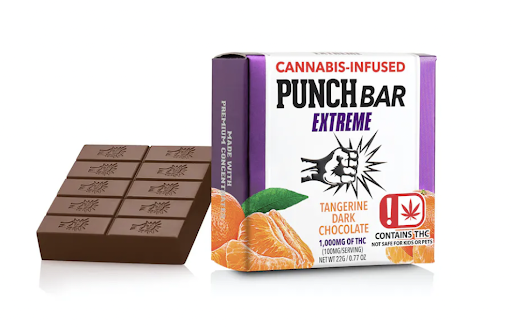 EXTREME Punch Bar are 1000 mgs! Immerse yourself in the decadence of rich dark chocolate infused with the essence of tangerine. Our Punch Bar delivers a harmonious blend of indulgent flavors that will captivate your taste buds. Experience the perfect balance of intense dark chocolate and vibrant tangerine notes with every delectable piece of our Punch Bar.