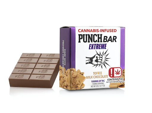EXTREME Punch bars are 1000 mgs! Toffee milk chocolate Punch Bars are a delectable combination of smooth, creamy milk chocolate and the irresistible sweetness of toffee. The milk chocolate provides a velvety base with its luscious texture and subtle cocoa flavors, while the toffee adds a delightful caramelized sweetness and a hint of buttery richness.